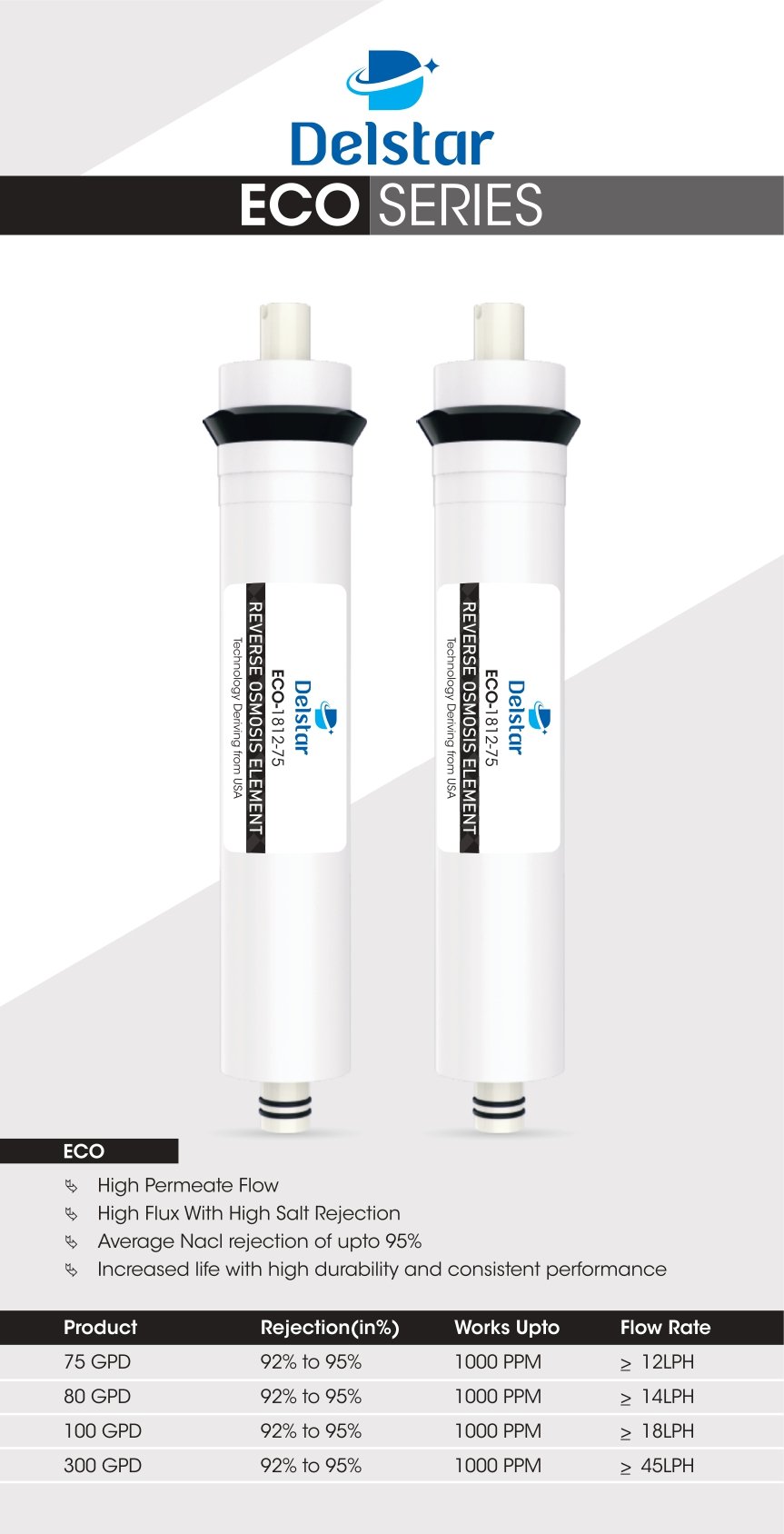 ECO High Permeate Flow High Flux With High Salt Rejection Average Nacl rejection of upto 95% Increased life with high durability and consistent performance