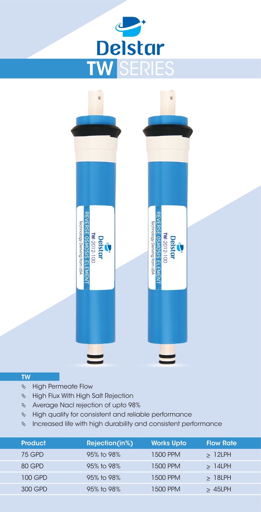 TW High Permeate Flow High Flux With High Salt Rejection Average Nacl rejection of upto 98% High quality for consistent and reliable performance Increased life with high durability and consistent performance.