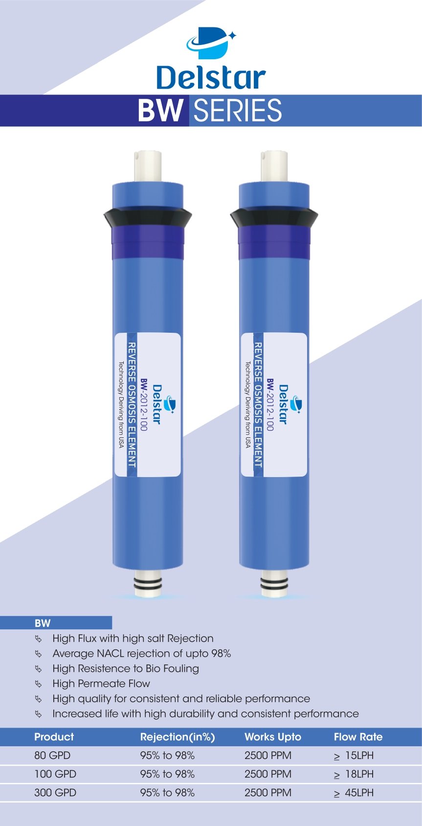 BW High Flux with high salt Rejection Average NACL rejection of upto 98% High Resistence to Bio Fouling High Permeate Flow High quality for consistent and reliable performance Increased life with high durability and consistent performance