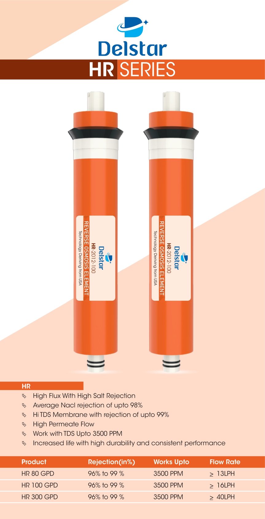 HR High Flux With High Salt Rejection Average Nacl rejection of upto 98% Hi TDS Membrane with rejection of upto 99% High Permeate Flow Work with TDS Upto 3500 PPM Increased life with high durability and consistent performance