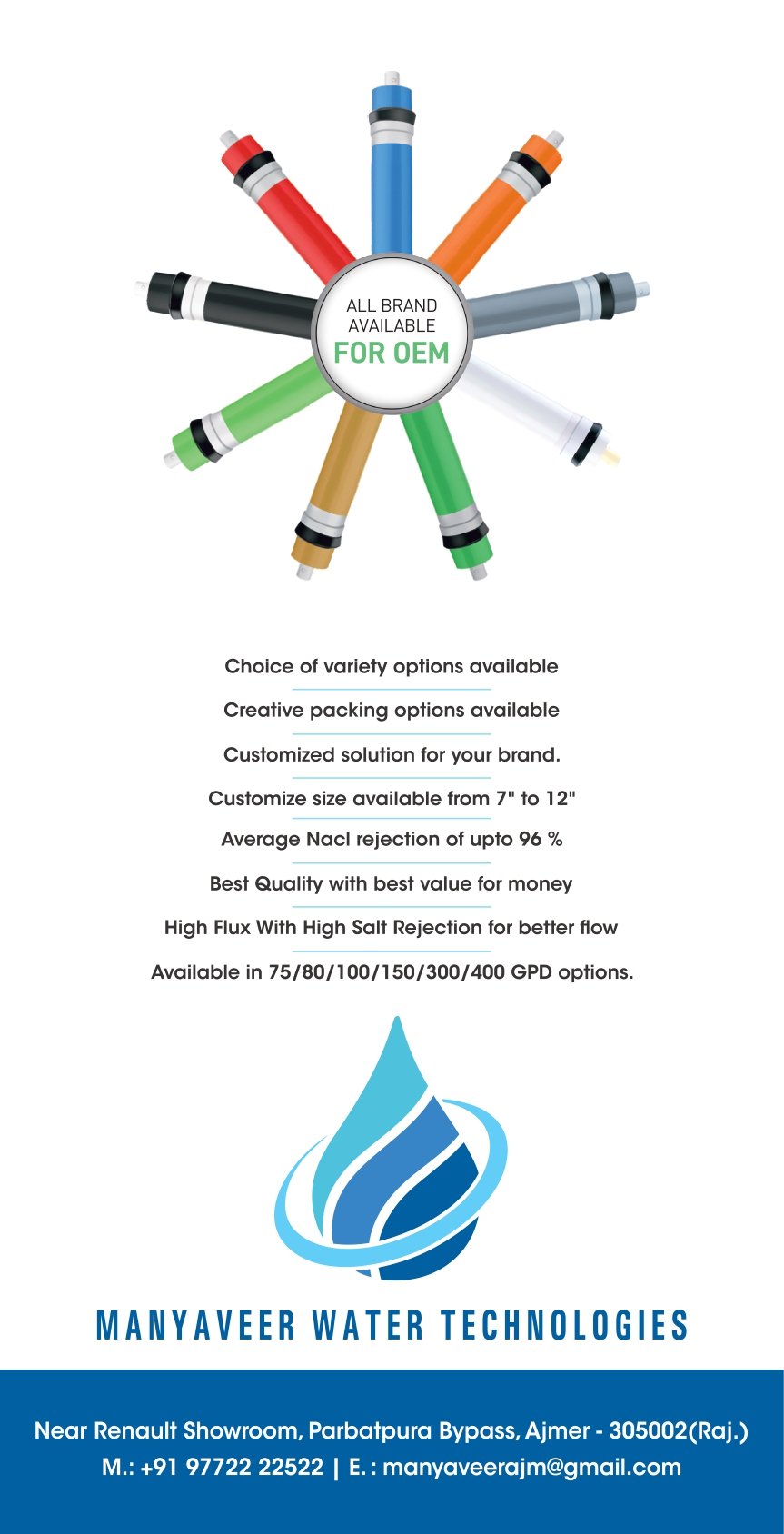 Manyaveer Water Technologies is a leading manufacturer of high-quality Reverse Osmosis (RO) membranes for residential, commercial, industrial, brackish water, and seawater applications. Based in Ajmer, India, we are committed to delivering advanced membrane solutions that offer high performance, long life, and energy efficiency.